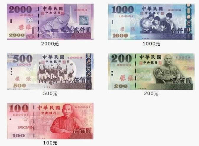 - 纸币: 常用: NT$100, NT$500, NT$1000 很少使用: NT$200, NT$2000